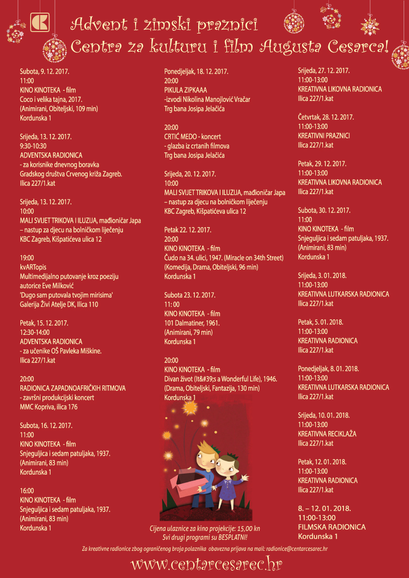 U nastavku vam donosimo adventski program događanja u organizaciji Centra za kulturu i film Augusta Cesarca. Veselimo se zajedničkim druženjima..