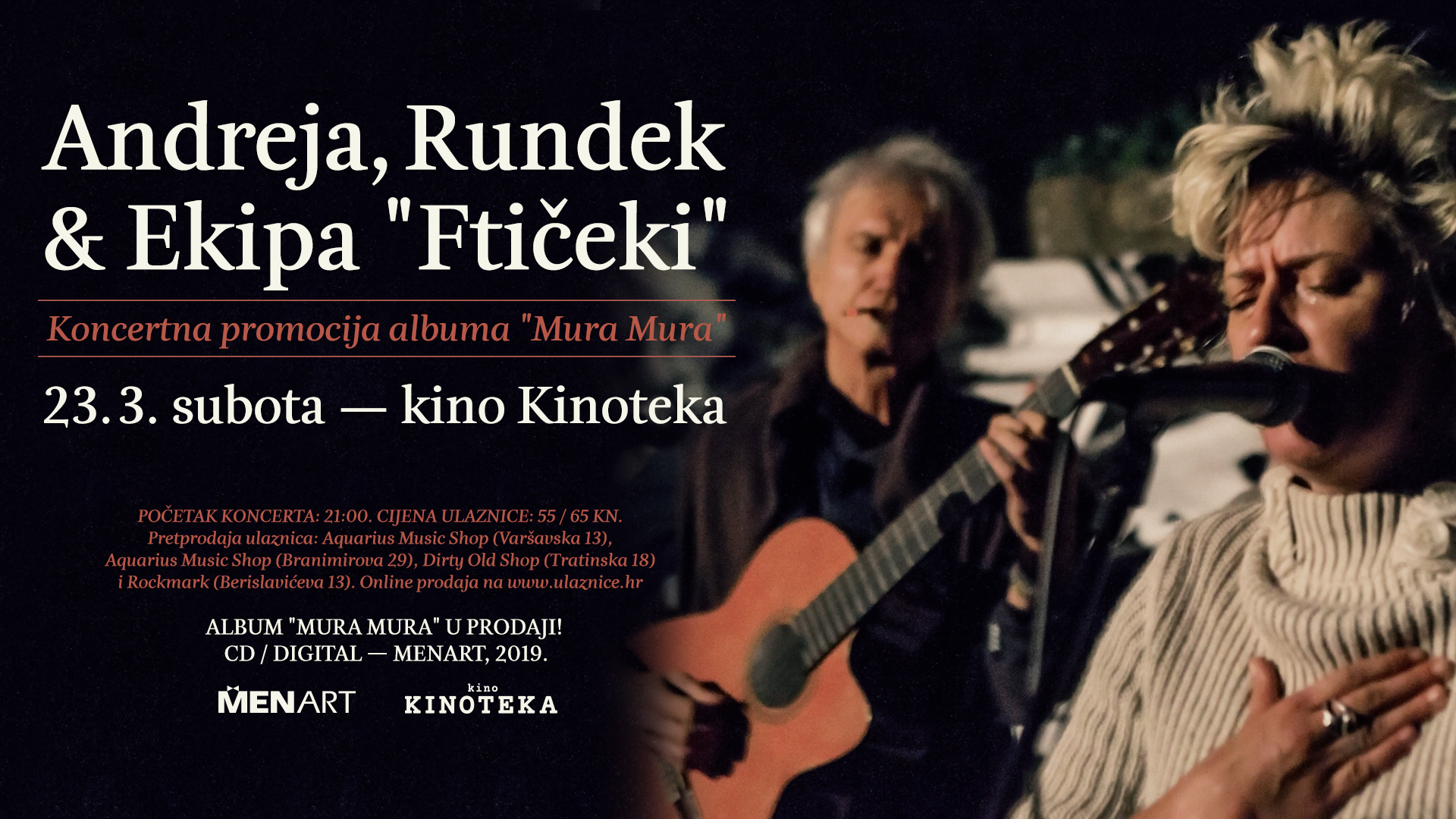 U suradnji s Menartom i FonoKinotekom, glazbenim programom kina Kinoteka, Andreja, Rundek & Ekipa „Ftičeki“, 23. ožujka zagrebačkoj će publici predstaviti aktualni studijski album „Mura Mura“.