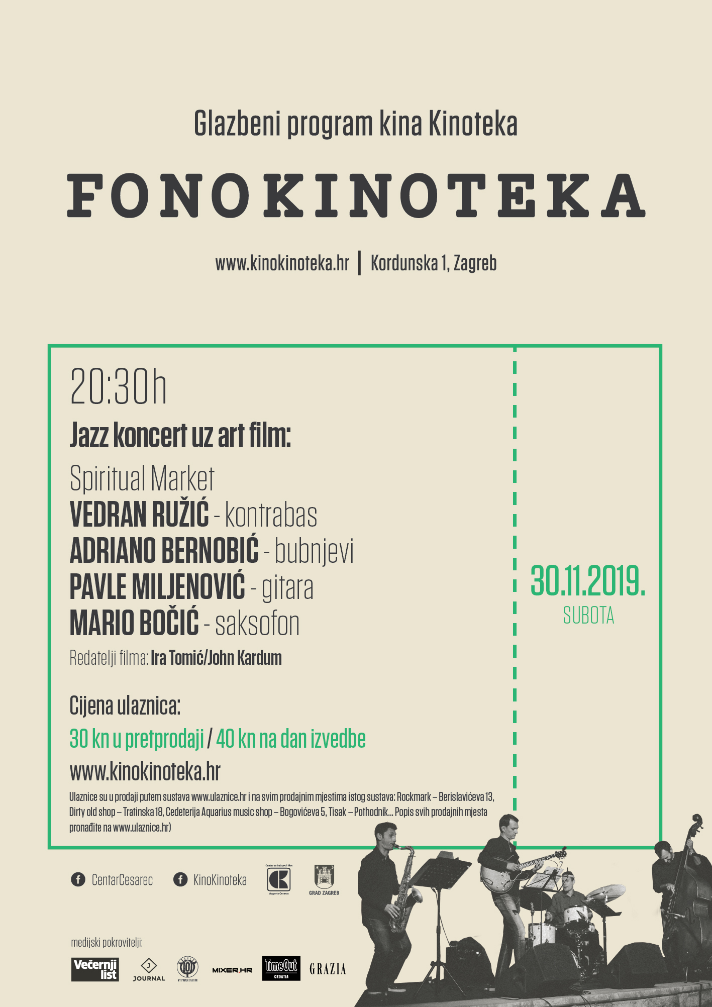 Cijena ulaznice 30 kn u pretprodaji / 40 kn na dan izvedbe. Blagajna kina Kinoteka će iznimno u subotu na dan koncerta raditi od 18.00h