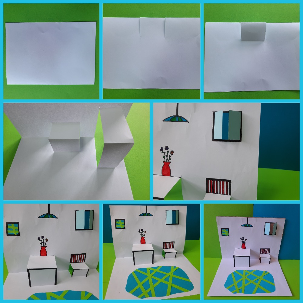Iz kolaža ili časopisa izrežite ostale dijelove interijera, npr. sliku, tepih, luster, prozorsko staklo…Isto možete obojati i flomasterima.