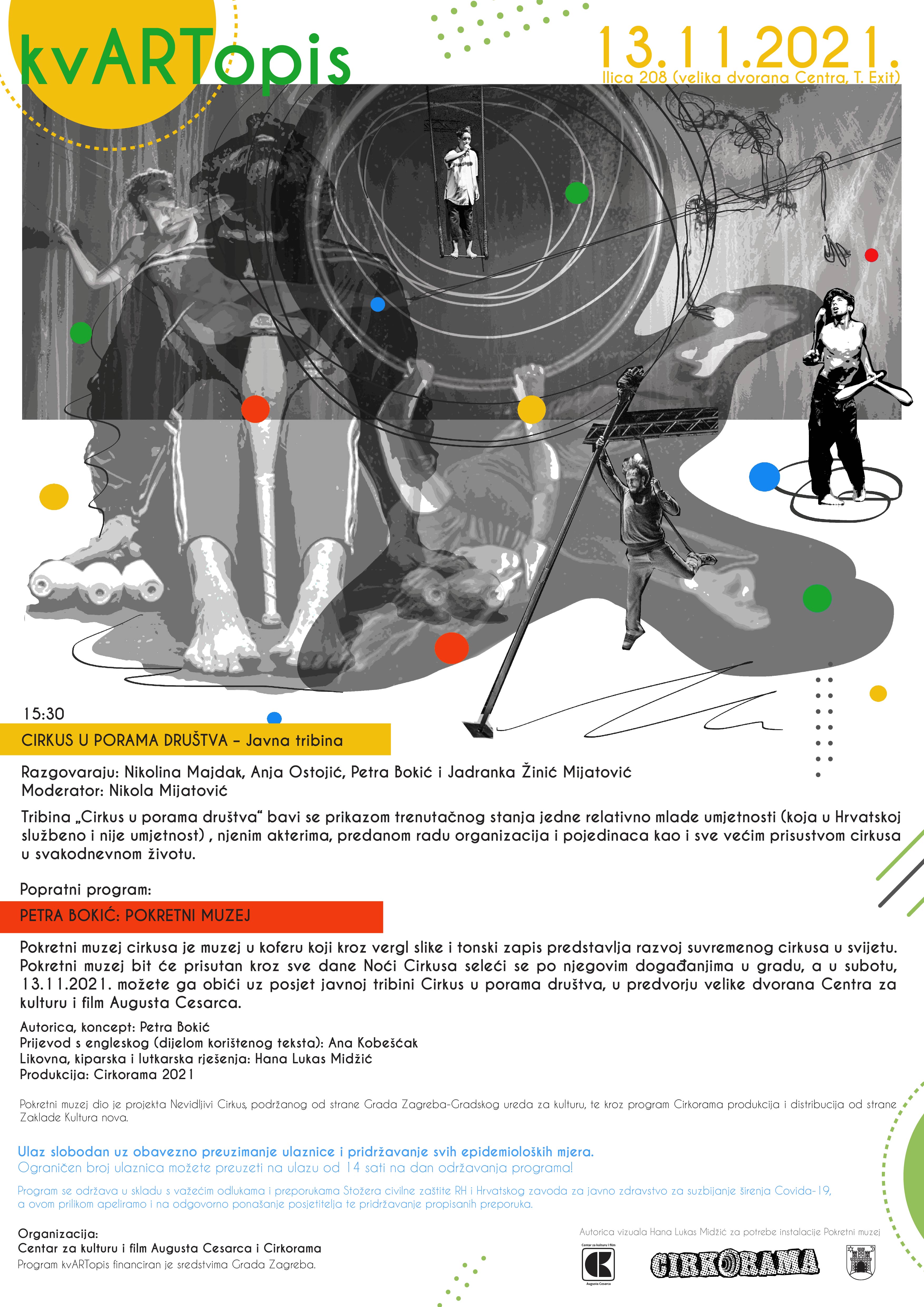 Pokretni muzej cirkusa je muzej u koferu koji kroz vergl slike i tonski zapis predstavlja razvoj suvremenog cirkusa u svijetu. Pokretni muzej bit će prisutan kroz sve dane Noći Cirkusa seleći se po njegovim događanjima u gradu, a u subotu, 13.11.2021. možete ga obići uz posjet javnoj tribini Cirkus u porama društva, u predvorju velike dvorana Centra za kulturu i film Augusta Cesarca (T.Exit).