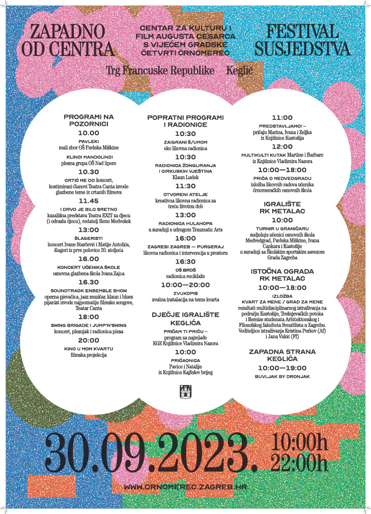 10.00 – 18.00 h – izložba, Kvart za mene / grad za mene, rezultati multidisciplinarnog istraživanja na području Kustošije, Trešnjevačkih potoka i Remize studenata Arhitektonskog i Filozofskog fakulteta Sveučilišta u Zagrebu. Voditeljice istraživanja Kristina Perkov, Arhitektonski fakultet i Jana Vukić, Filozofski fakultet