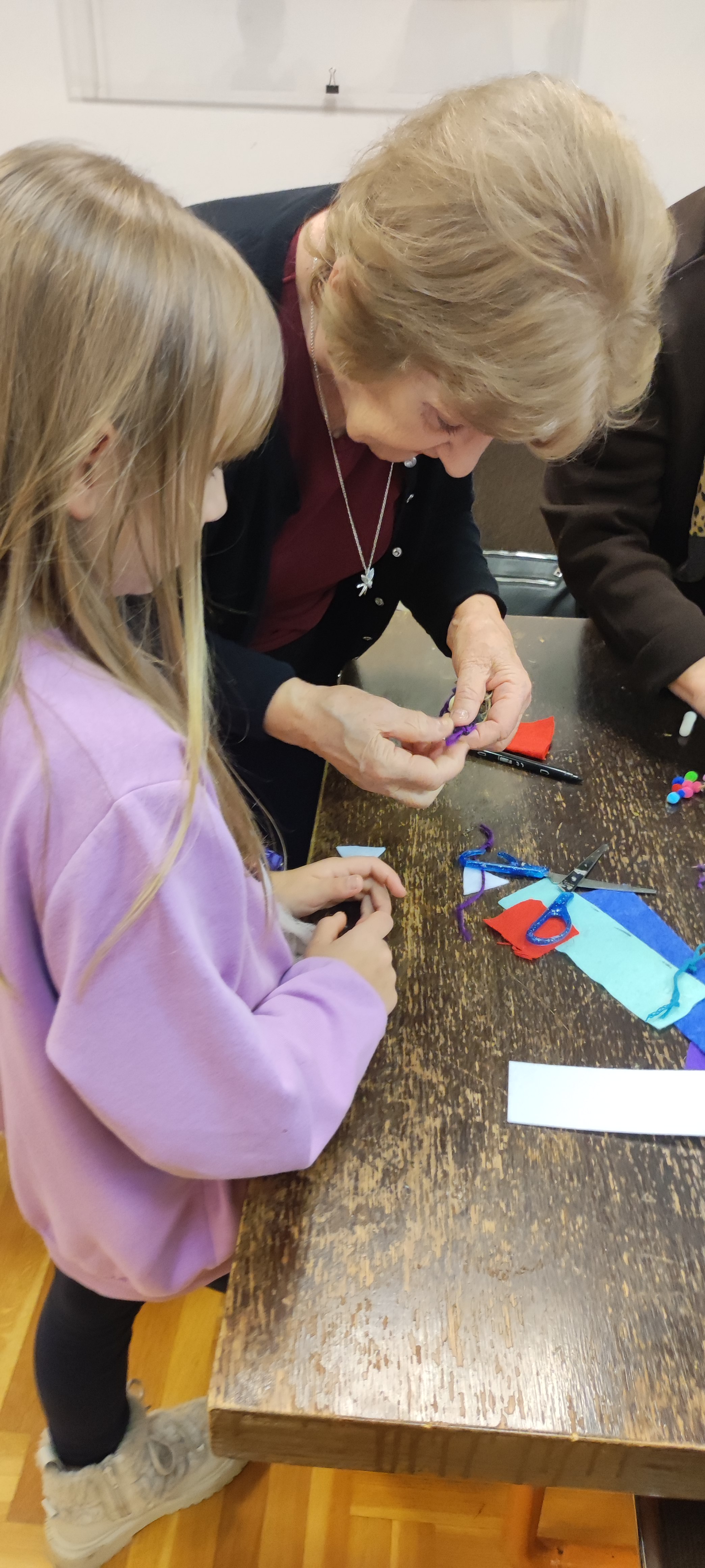 Radosna adventska međugeneracijska radionica izrade ukrasa za jelku u Knjižnici Kajfešov brijeg. Sudjelovali učenici 3. B razreda OŠ Pavleka Miškine i učiteljca Sandra Huzjak, korisnici Doma Sveti Josip i socijalna radnica Ljiljana Jelenčić.