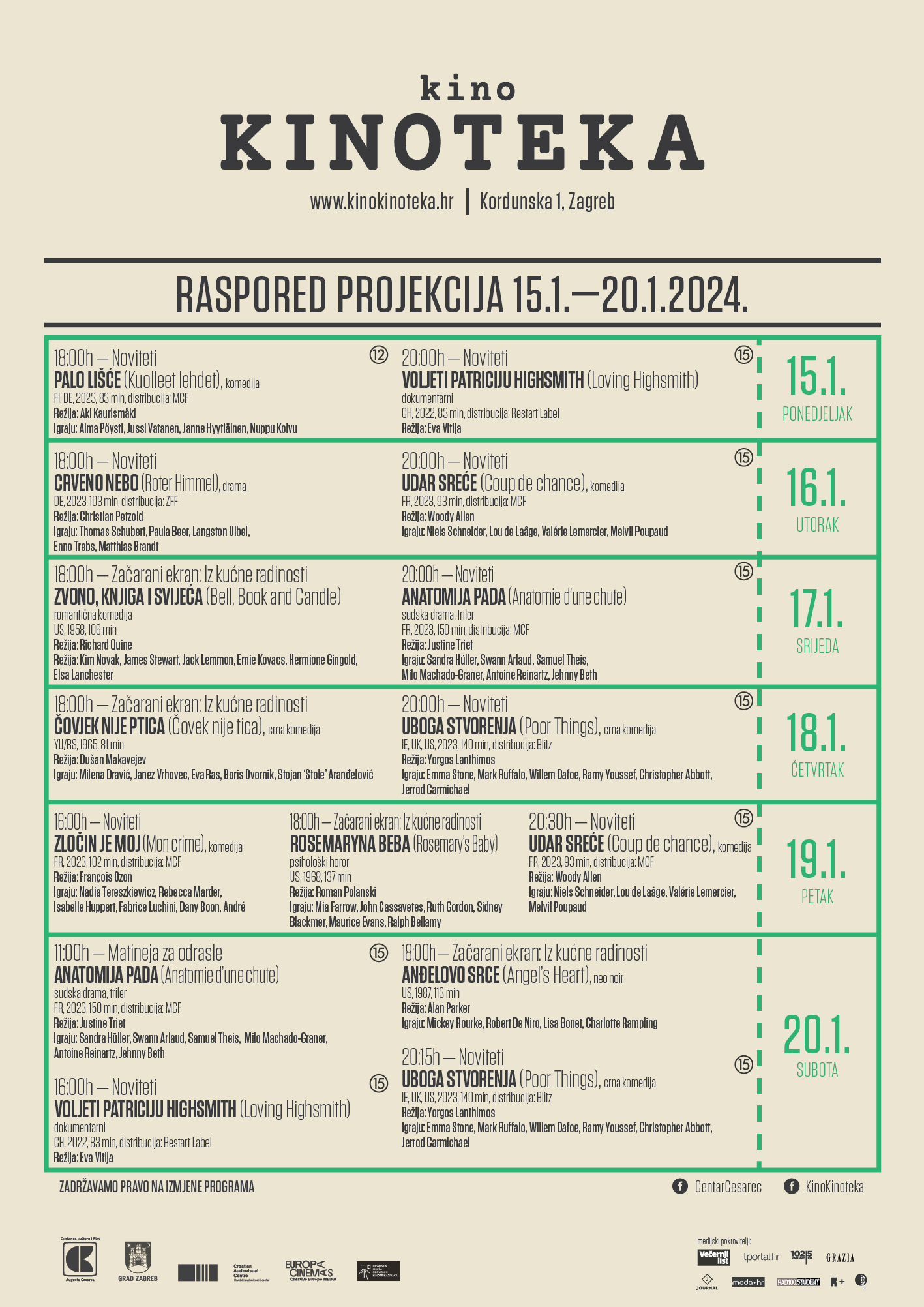 Ovotjedni Začarani ekran istražuje magijske prakse iz kućne radinosti u režiji Dušana Makavejeva, Romana Polanskog i Alana Parkera, a među Novitete stižu Zlatnim lavom nagrađena crna komedija Uboga stvorenja Yorgosa Lanthimosa i dokumentarni film Voljeti Patriciju Highsmith o životu kraljice psiholoških trilera.