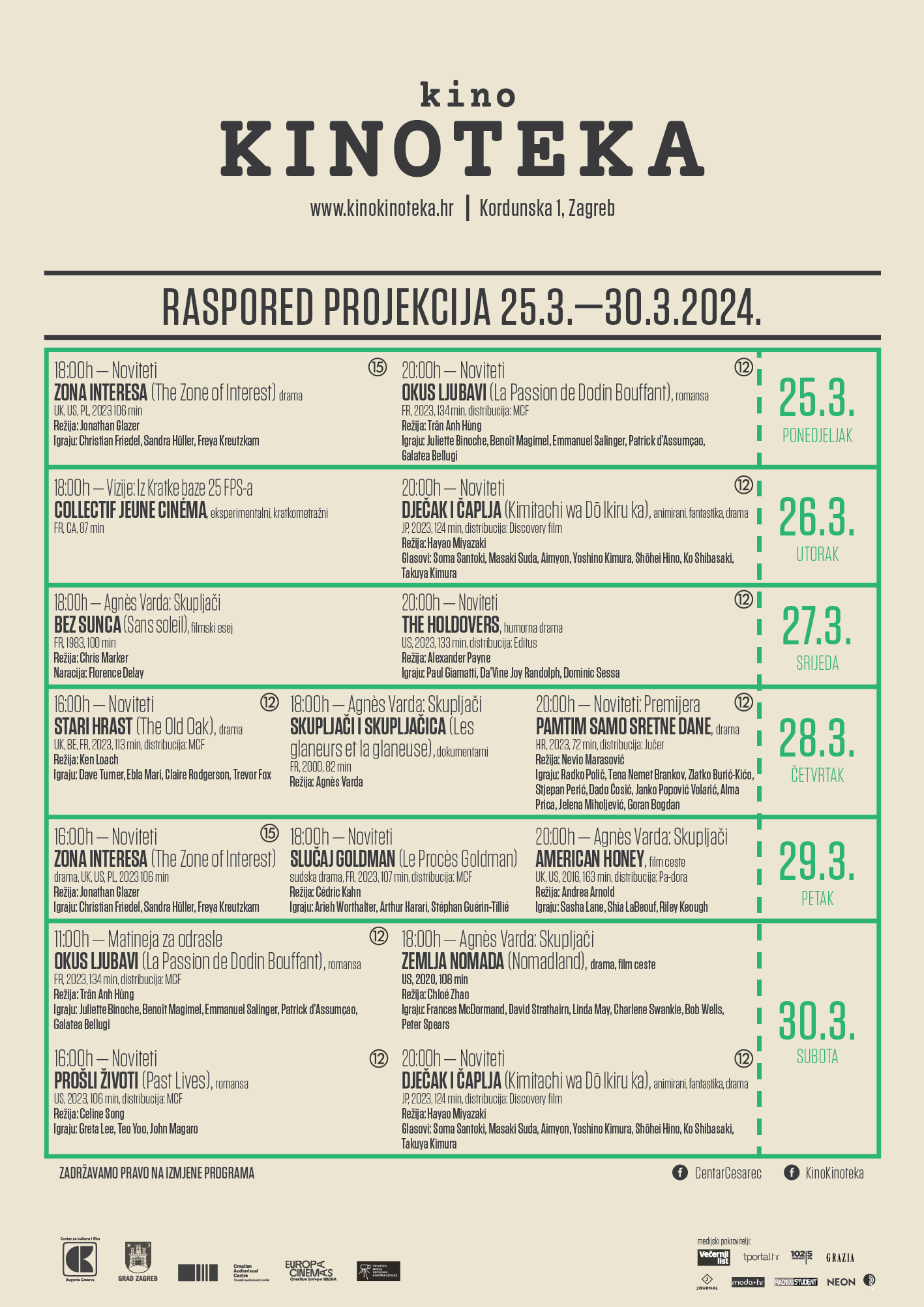 Ciklus Agnès Varda nastavljamo posvetom njezinu antologijskom ostvarenju – dokumentarcu Skupljači i skupljačica, Vizije: Iz Kratke baze 25 FPS-a predstavljaju produkciju kolektiva Jeune Cinéma, a među Novitete stiže uzbudljiva sudska drama Slučaj Goldman Cédrica Kahna.
