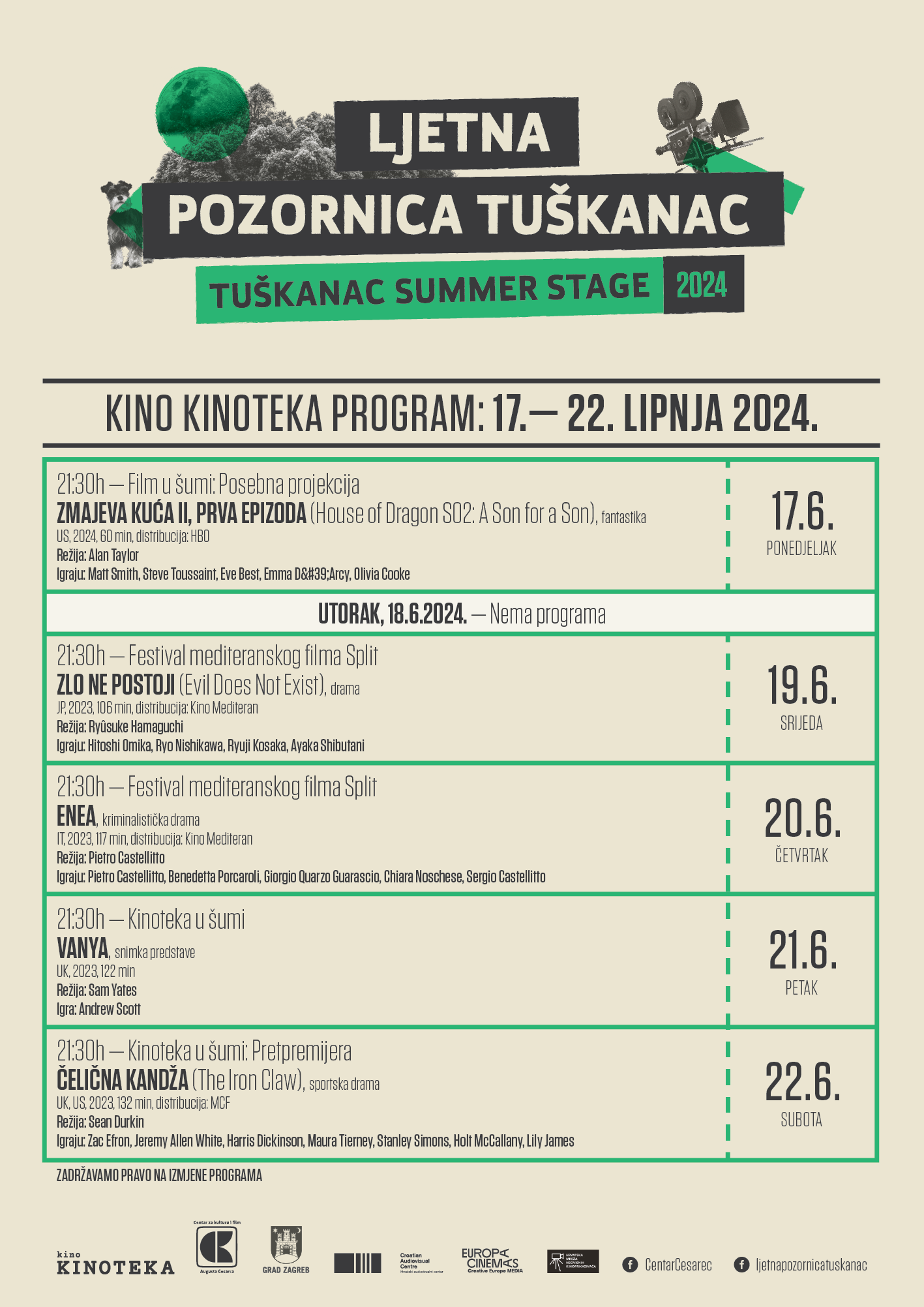 Srpanj na Ljetnoj pozornici Tuškanac tradicionalno je rezervirani za gostujuće programe filmskih festivala, a kolovoz je rezerviran za Film u šumi, u sklopu kojeg kombiniramo atraktivne distribucijske naslove s klasicima sedme umjetnosti.