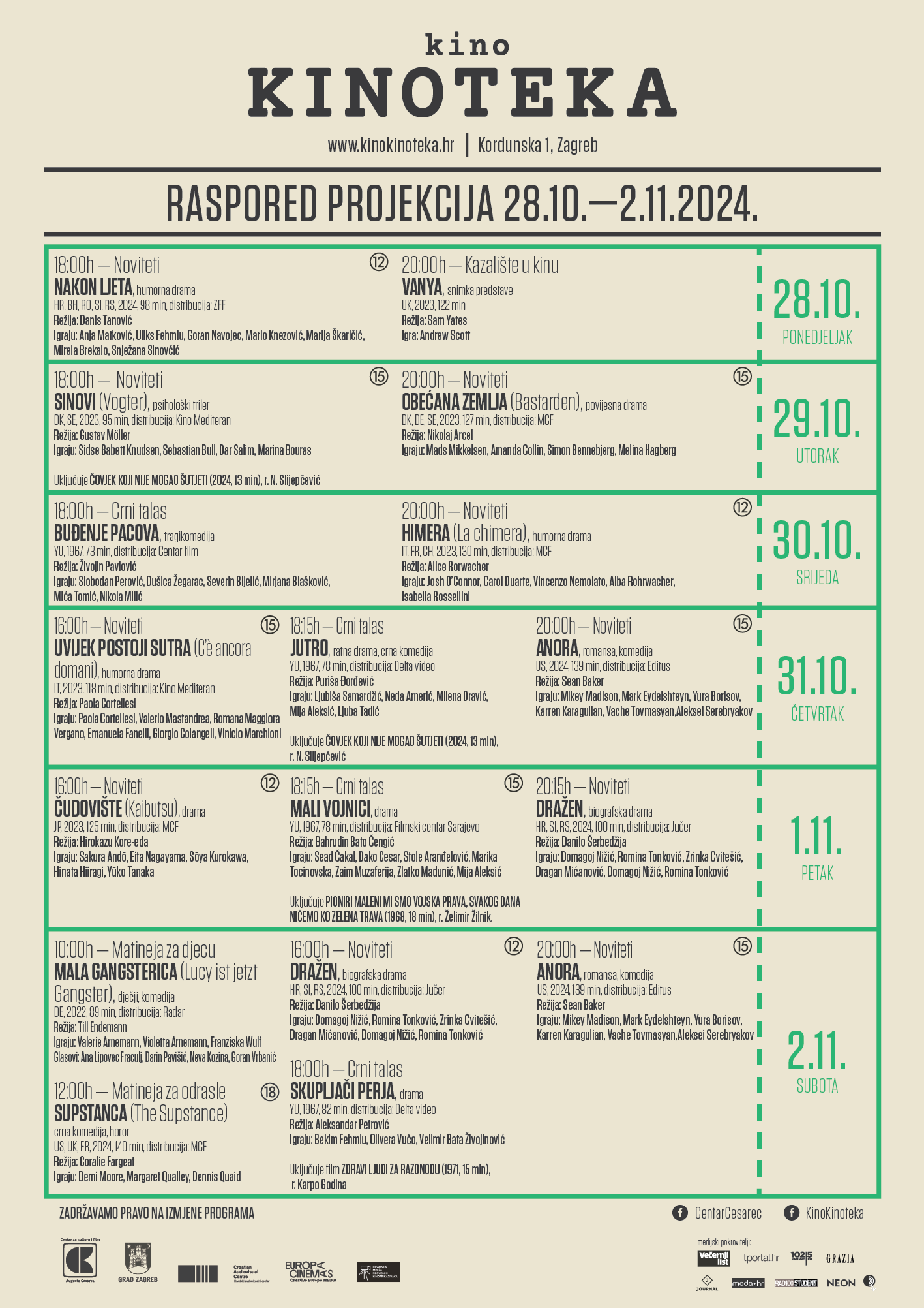 Ciklus Crni talas na veliko platno donosi klasike Buđenje pacova Živojina Pavlovića i Skupljači perja Aleksandra Petrovića, među Novitetima gledamo Zlatnom palmom nagrađenu komediju Anora Seana Bakera i biografsku dramu Dražen Danila Šerbedžije, a u tjedan ulazimo sa snimkom predstave Vanya iz londonskog National Theatrea.