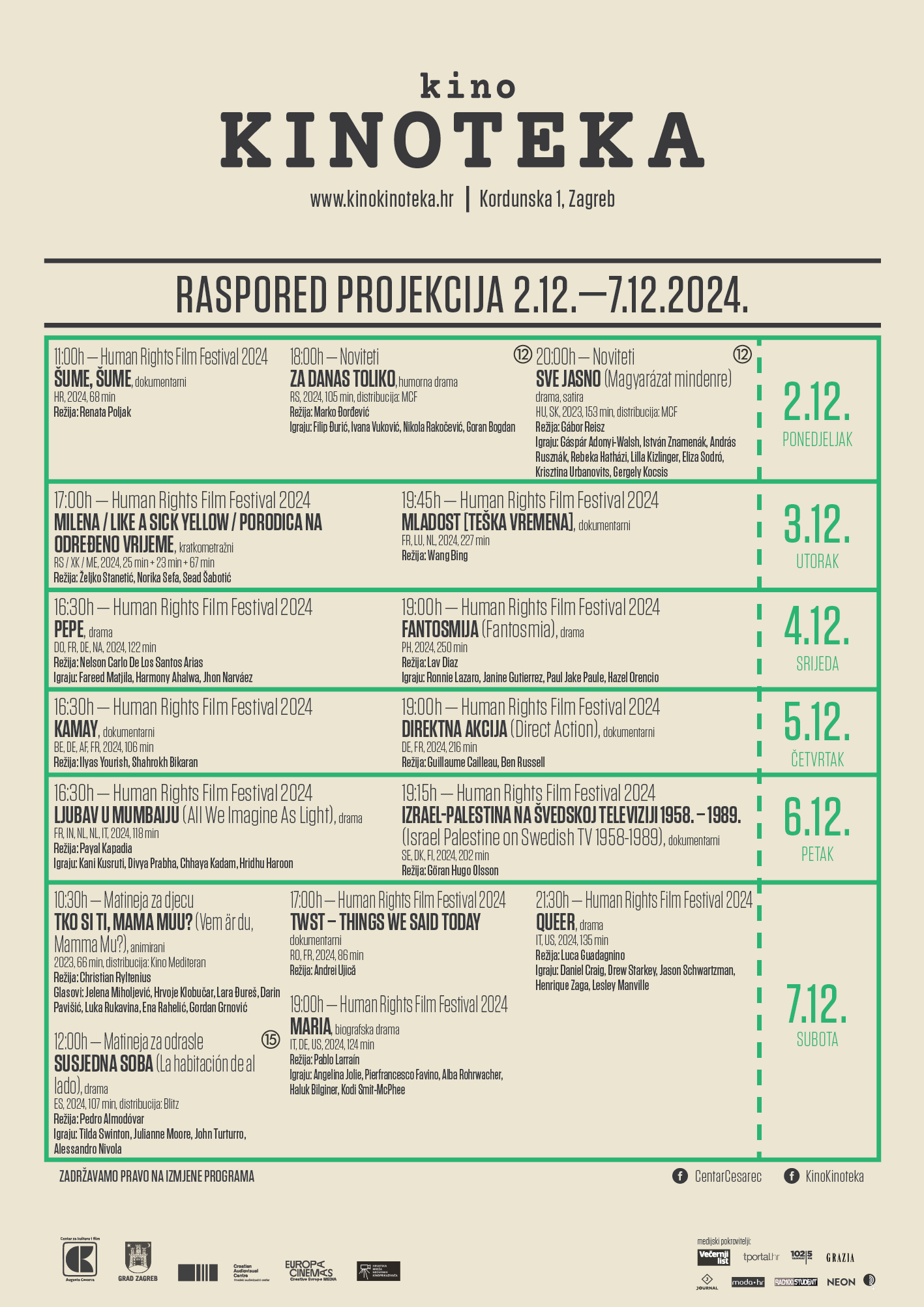 Novo izdanje Human Rights Film Festivala održat će se na nekoliko zagrebačkih lokacija, uključujući i kino Kinoteka, a donosi niz intrigantnih naslova koji su obilježili 2024. godinu. Među atraktivnijim ostvarenjima svakako su Ljubav u Mumbaiju indijske redateljice Payal Kapadia, nagrađen Grand Prixom u Cannesu, zatim biografska drama Maria Pabla Larraína, u kojem Angelina Jolie glumi opernu divu iz naslova, te novi film Luce Guadagnina Queer s Danielom Craigom u glavnoj ulozi.