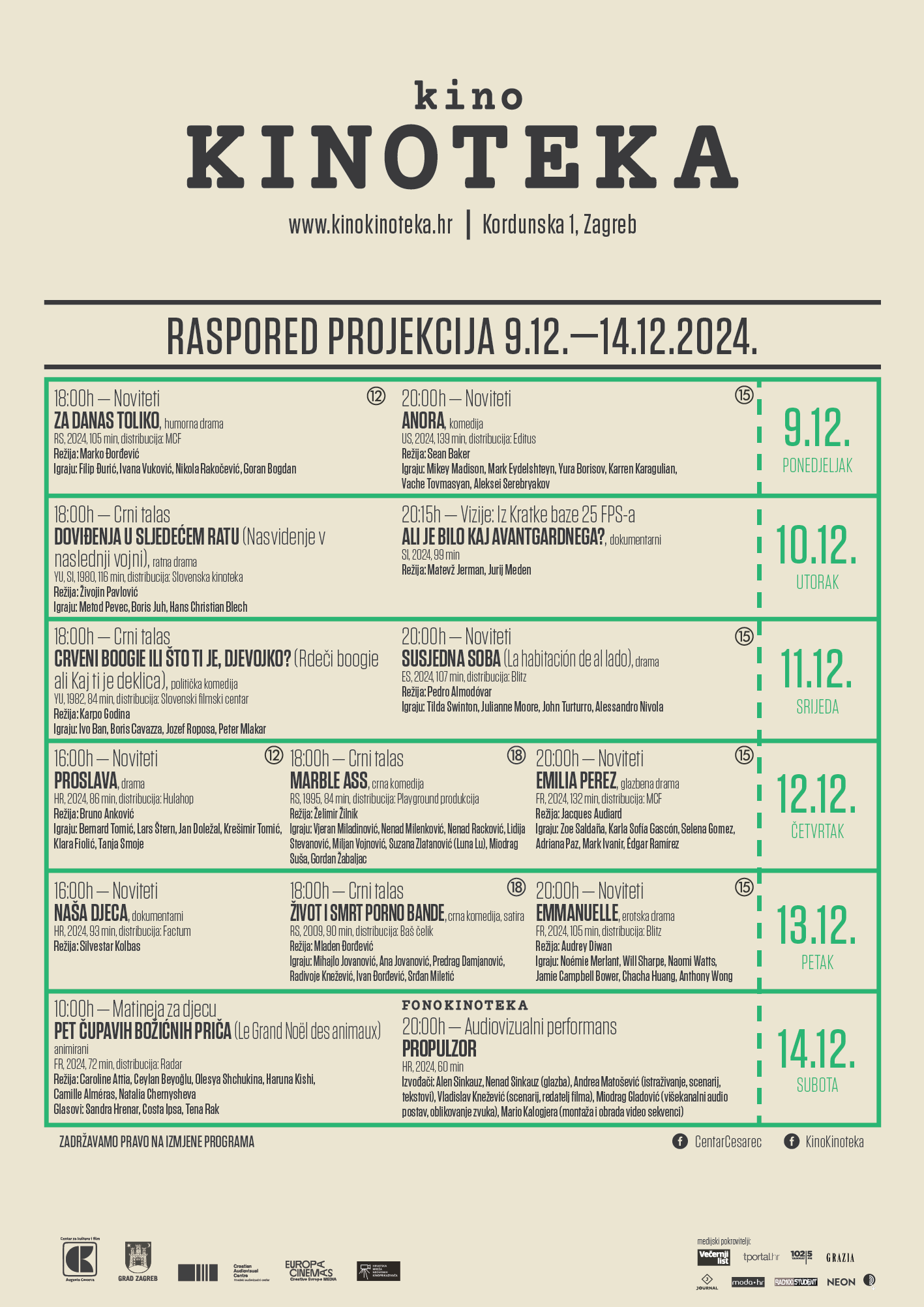 Na repertoaru su i dvije komedije koje izazivaju veliki interes gledatelja: Anora Seana Bakera i Za danas toliko Mladena Đorđevića, a tu su i laureati ovogodišnjeg Pulskog filmskog festivala: Proslava Brune Ankovića i Naša djeca Silvestra Kolbasa.