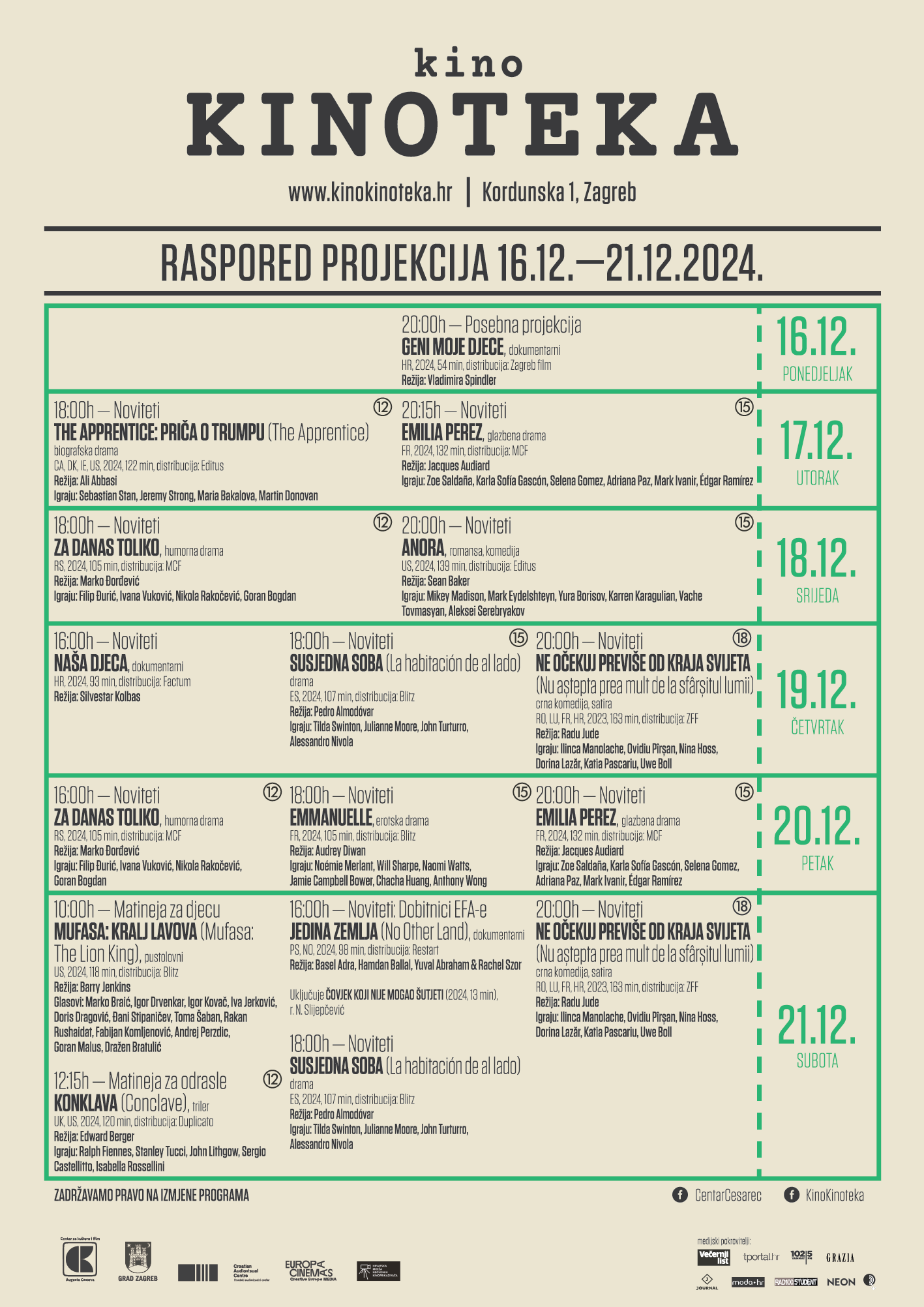 U tjedan ulazimo premijerom filma Geni moje djece Vladimire Spindler, među novitete stiže Ne očekuj previše od kraja svijeta Radua Judea, a povodom osvajanja Europske filmske nagrade na repertoar vraćamo dokumentarac Jedina zemlja i kratkometražni Čovjek koji nije mogao šutjeti Nebojše Slijepčevića.