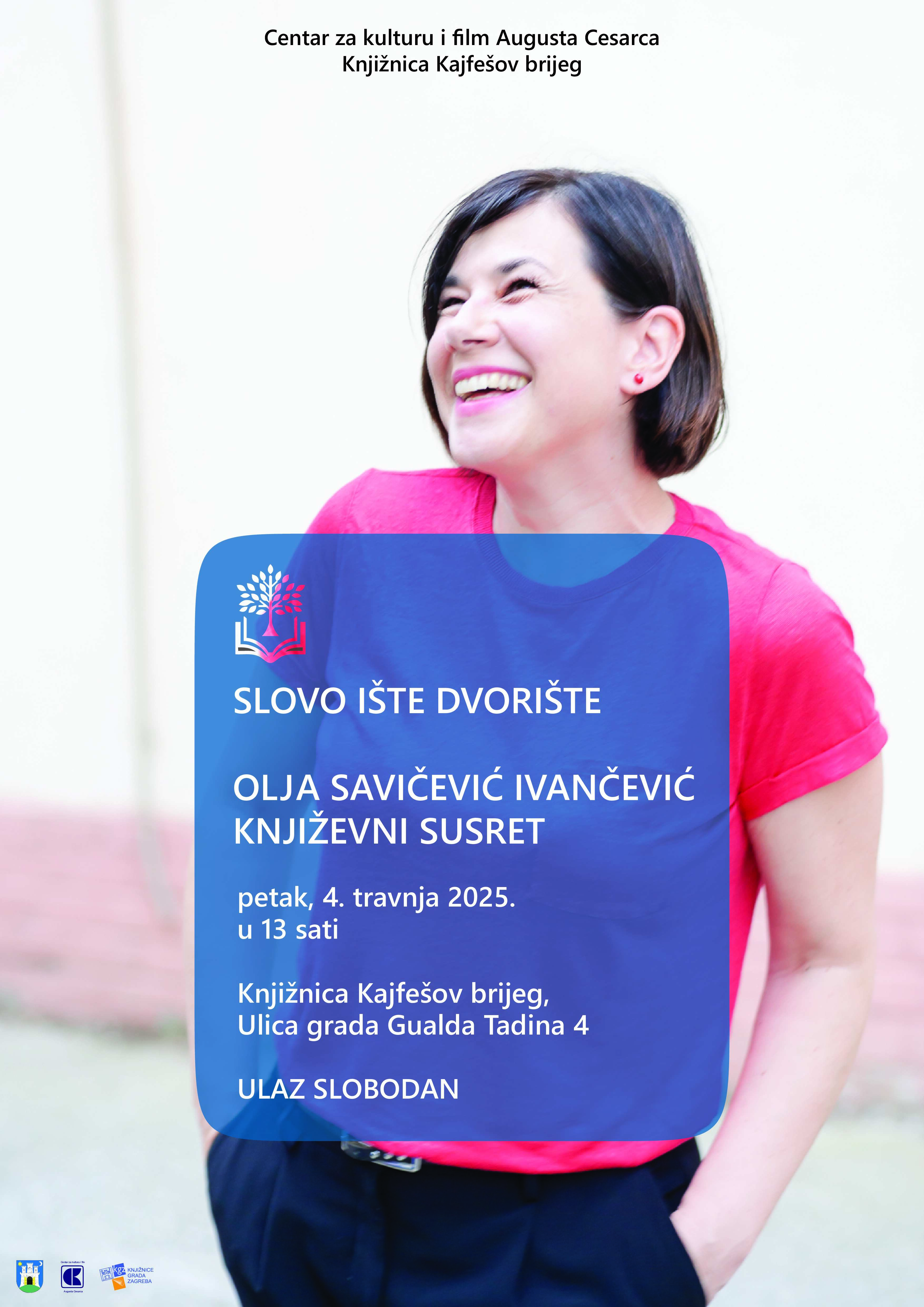 Ovogodišnje izdanje projekta Slovo ište dvorište započinjemo književnim susretom sa spisateljicom Oljom Savičević Ivančević koja osim proze i poezije, piše književne kolumne, dramske tekstove, uređuje knjige te vodi radionice kreativnog pisanja. Na susretu će biti riječi o Oljina dva romana, ADIO KAUBOJU i LJETA S MARIJOM.