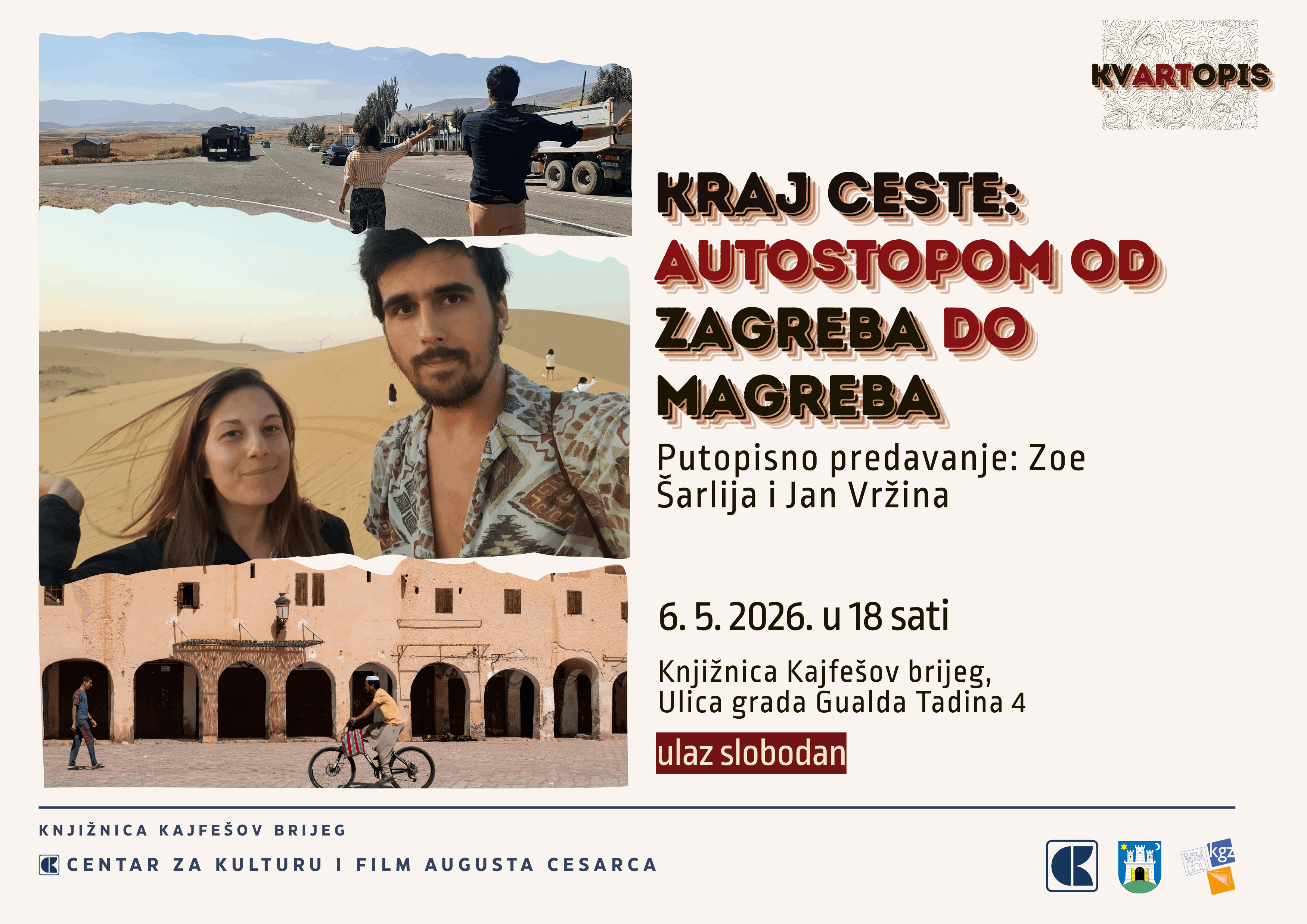 Započet na Instagramu @krajceste kao priprema za putopisno-fotografsku knjigu, rad se bazira na stoperskom putovanju u ljeto 2023. godine od Zagreba do Alžira, preko Crne Gore, Albanije, Italije i Tunisa. Iako je srž projekta vizualno-tekstualni narativ, Kraj ceste fleksibilne je prezentacijske prirode, stoga će se ovom prigodom njegov centralni motiv susreta s nepoznatim pretočiti u formu predavanja.