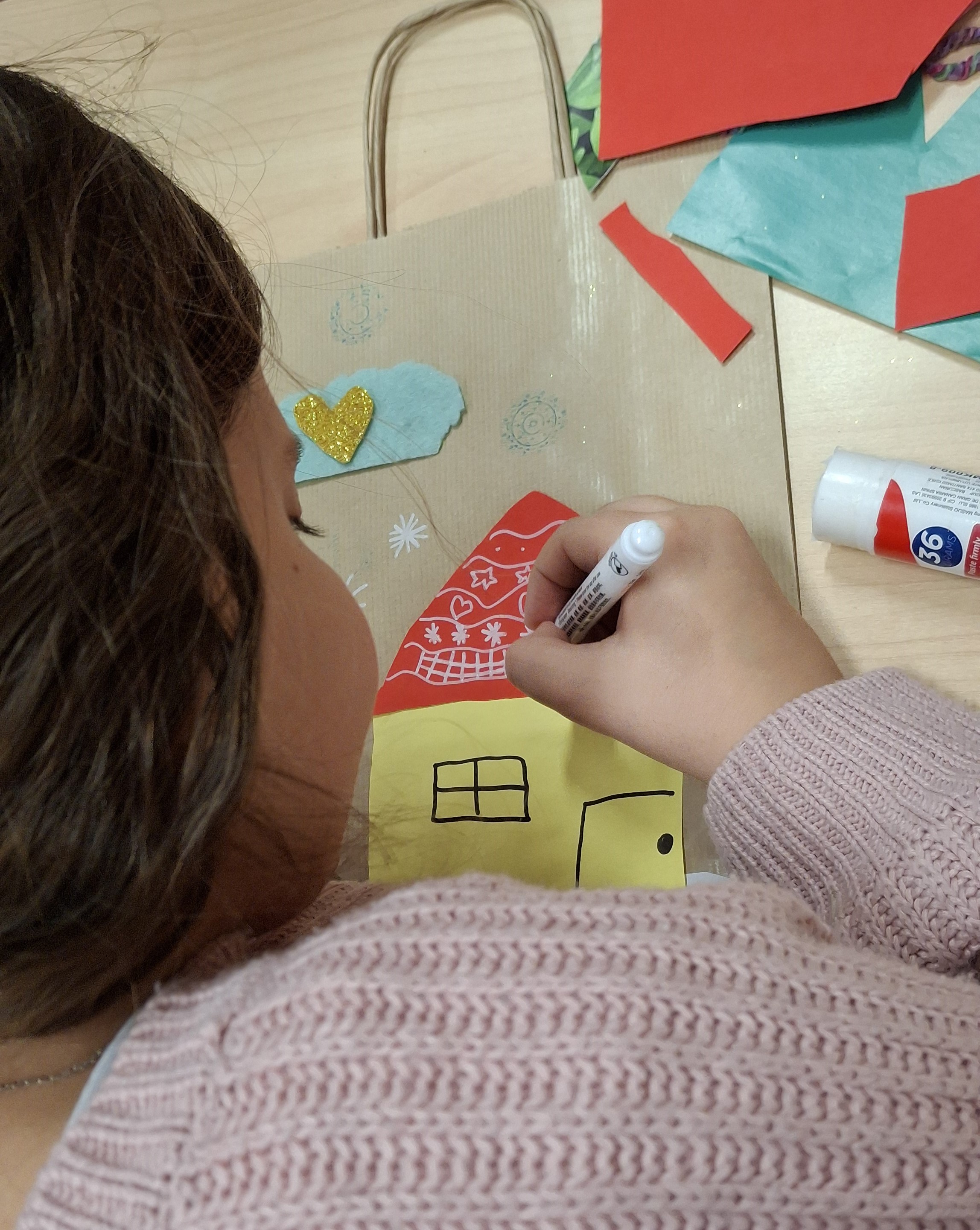 Radionice izrade božićnih darovnih vrećica. Sudjelovali učenici 3. d razreda OŠ Medvedgrad i 1. c razreda OŠ Kustošija.