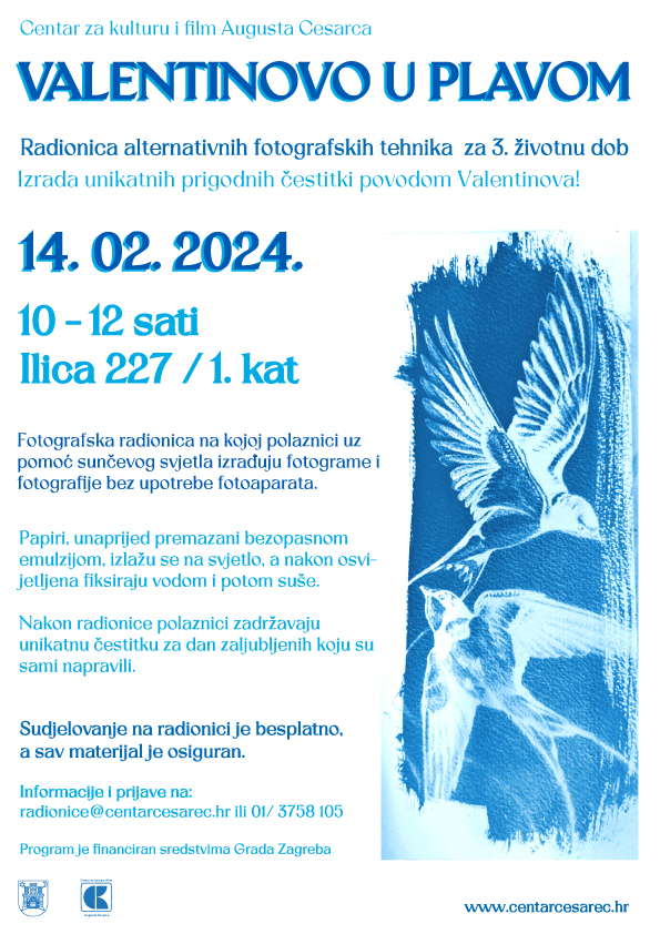 VALENTINOVO U PLAVOM Radionica alternativnih fotografskih tehnika za 3. životnu dob srijeda, 14. 2. 2024. 10 – 12 sati Ilica 227 / I. kat Fotografska radionica na […]