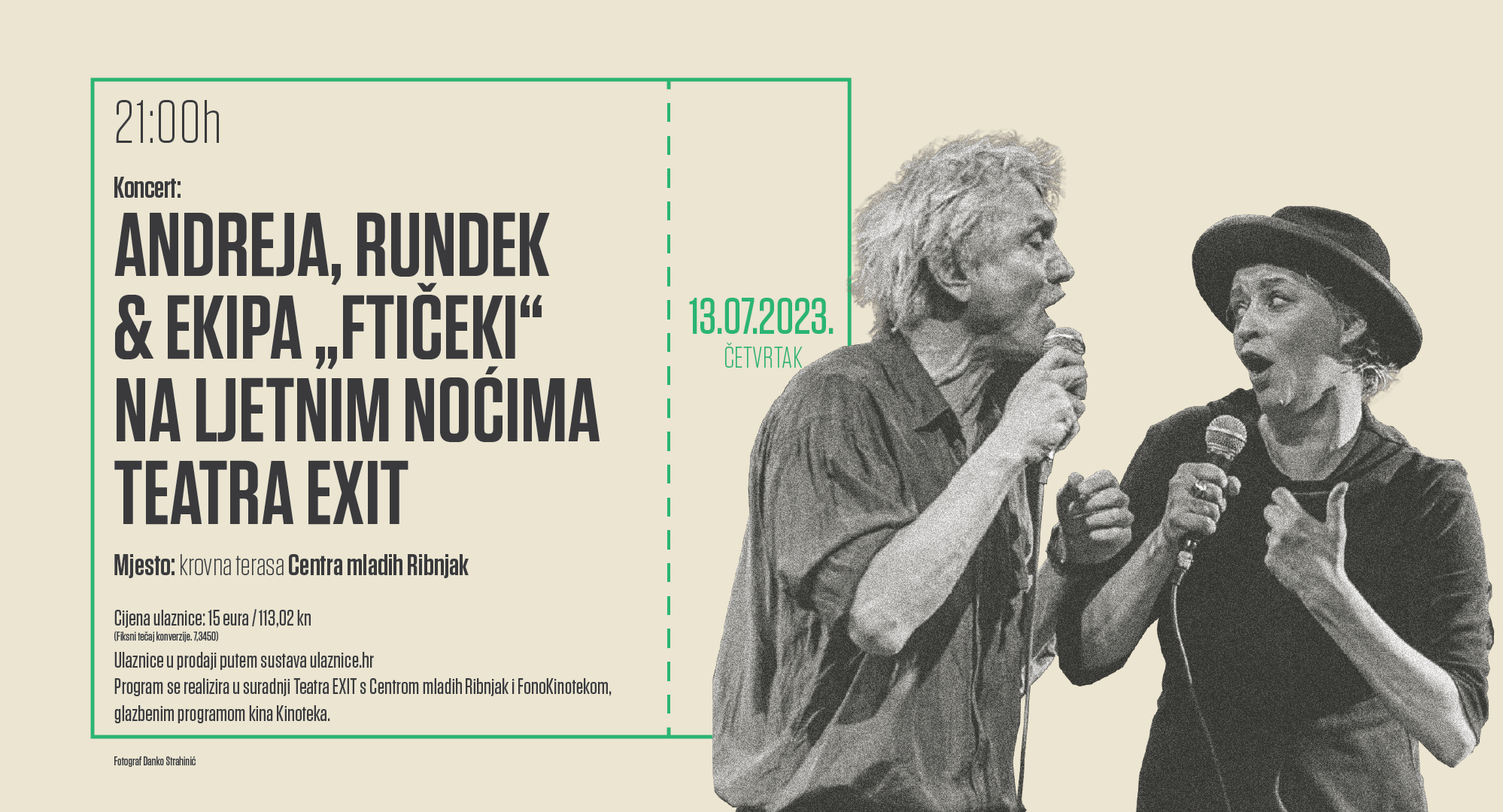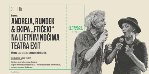 Koncert: Andreja, Rundek & Ekipa “Ftičeki” Četvrtak, 13.7. s početkom u 21 sat, Andreja, Rundek & Ekipa “Ftičeki” gostuju na Ljetnim noćima Teatra EXIT, na krovnoj terasi Centra mladih Ribnjak. Zagrebačku pjevačicu, […]