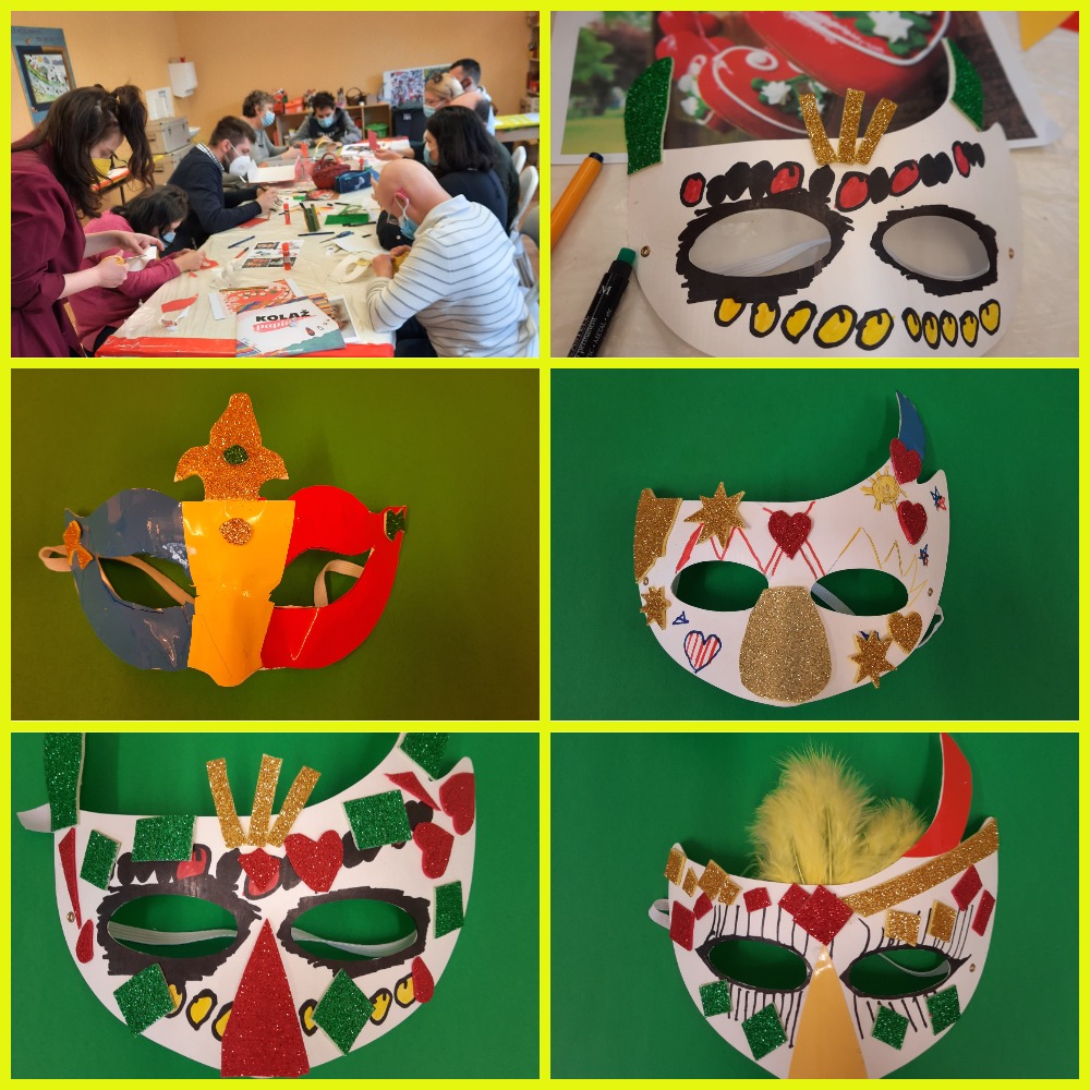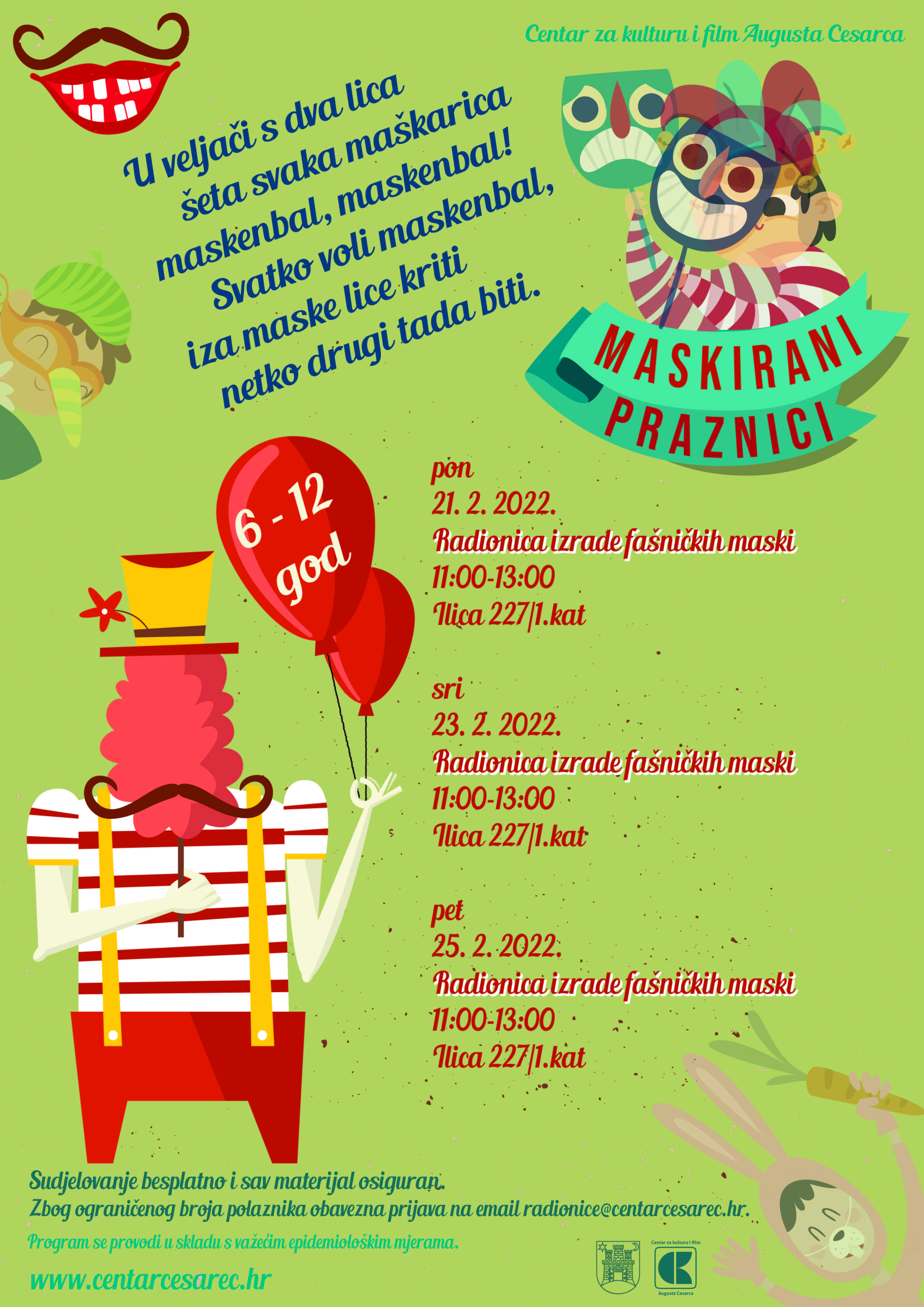 Radionica izrade fašničkih maski s temom licitara i ornamenata. Sudjelovali korisnici poludnevnog boravka Gradskog društva Crvenog križa. Voditeljica Ksenija Filipović.